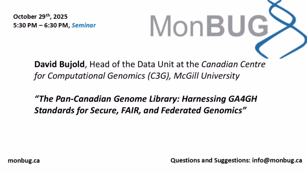 Join us on Wednesday, October 29, 2025, at 5:30 PM at the UQAM campus for our next MonBUG meetup to hear David Bujold, Head of the Data Unit at the Canadian Centre for Computational Genomics (C3G), present his talk, “The Pan-Canadian Genome Library: Harnessing GA4GH Standards for Secure, FAIR, and Federated Genomics”.